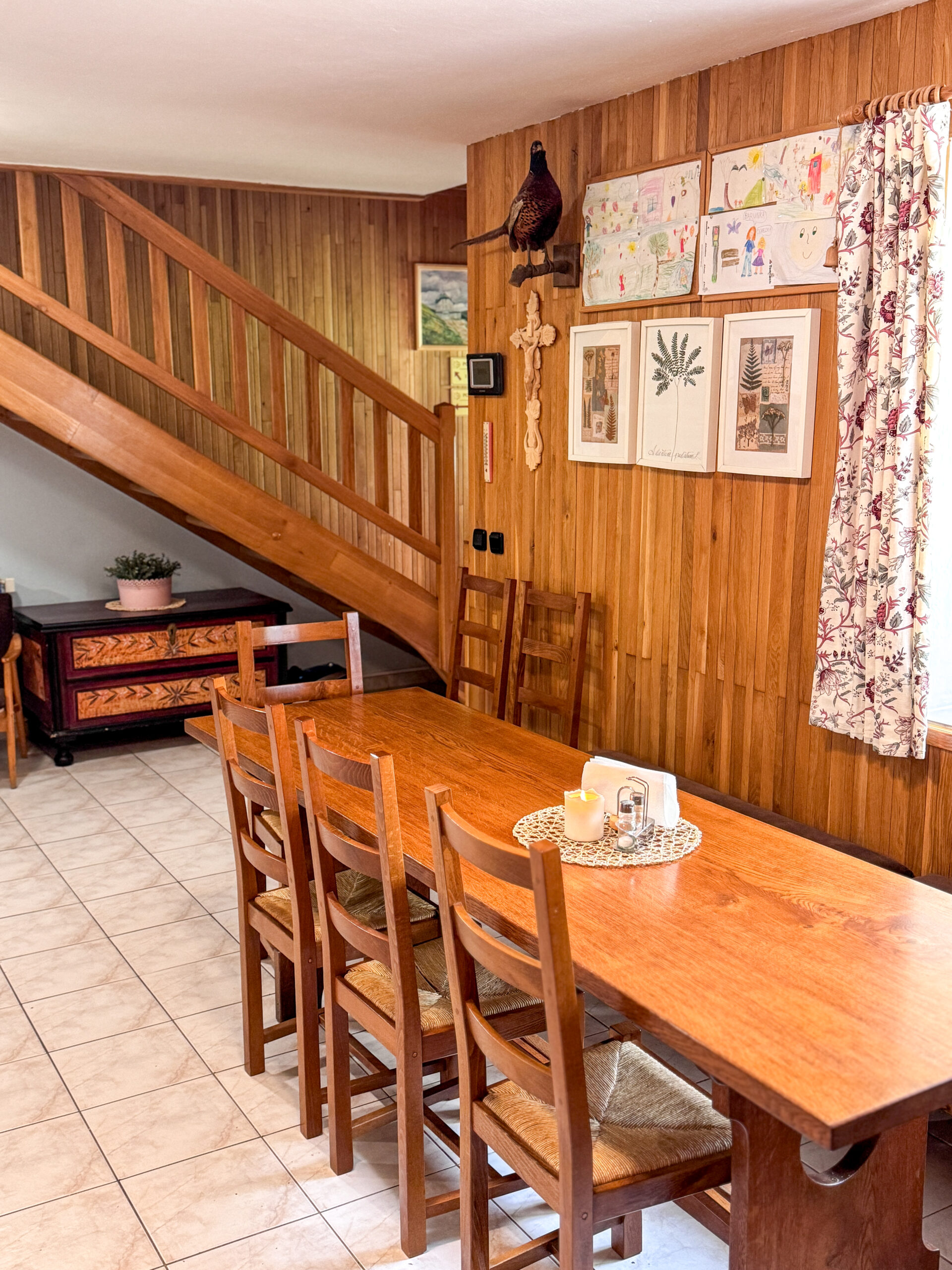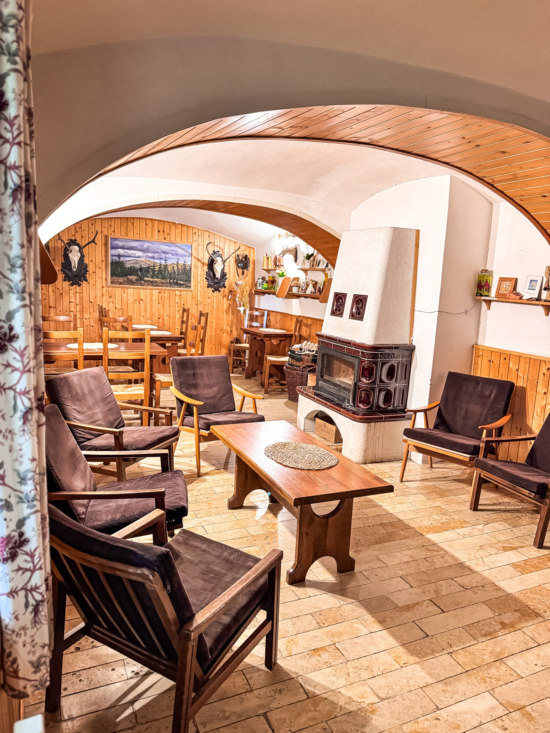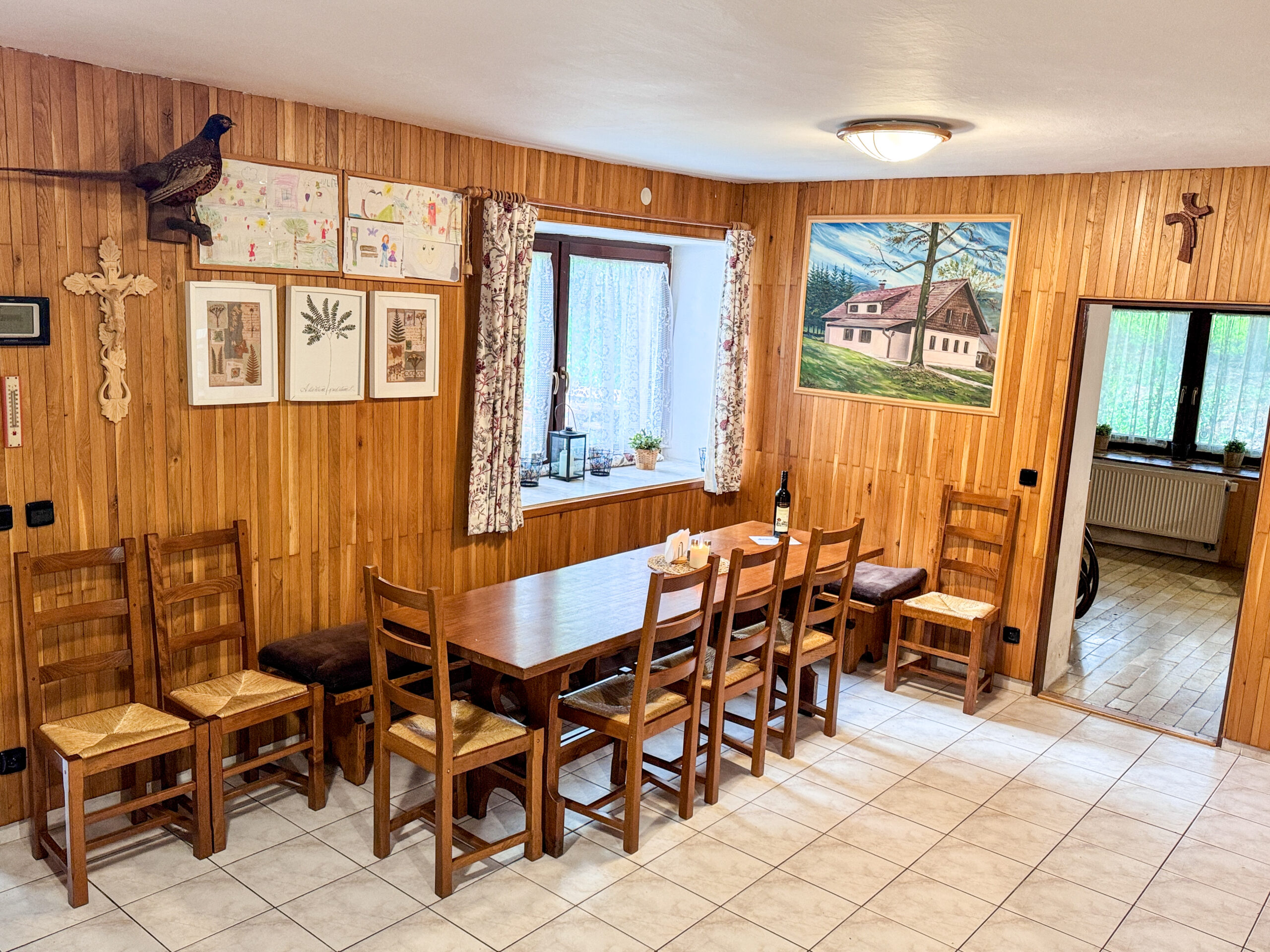 V přízemí se nachází společenská místnost s krbem a televizí, jídelna s velkým jídelním stolem a kuchyně. Ta je plně vybavená pro vlastní vaření, anebo je možné se stravovat v restauraci vzdálené cca 100 m od chaty.